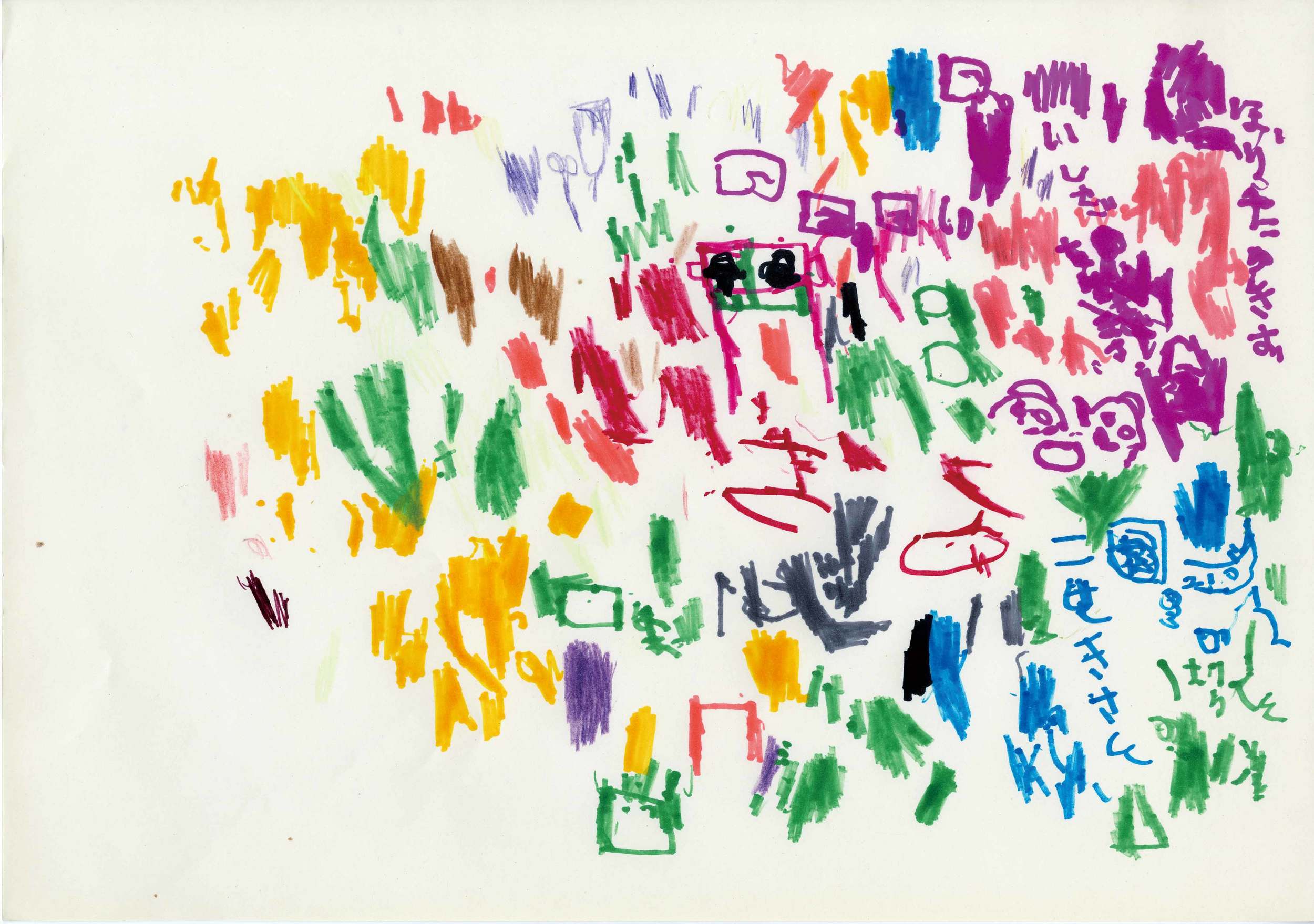 知的障害がありコミュニケーションに限りがあるHさん(60代・男性)の色鮮やかな線で埋め尽くされる抽象画は誰もの目を引きます。彼の造形範囲を広めるべく、色塗りのテンプレート、様々な画材や題材を進めても増した。しかし彼は色ペンでいつもの抽象画を書き続け、やめる傾向もなかった。これまで描いた絵を再び検証すると、なぜ彼がいつも同じ様な抽象画を描くかのヒントがありました。絵の中には施設のスタッフや(利用者である)友達を含む名前や家、ビル、鳥居などの建築物が含まれていました。彼の絵は単なる抽象画ではなく彼のビジュアル的な日記いわば思い出・記憶なのです。Hさんは口数が少なく言葉をあまり発さないため、自らの記憶を絵にすることが彼にとっての表現とコミュニケーションの一つなのかもしれません。